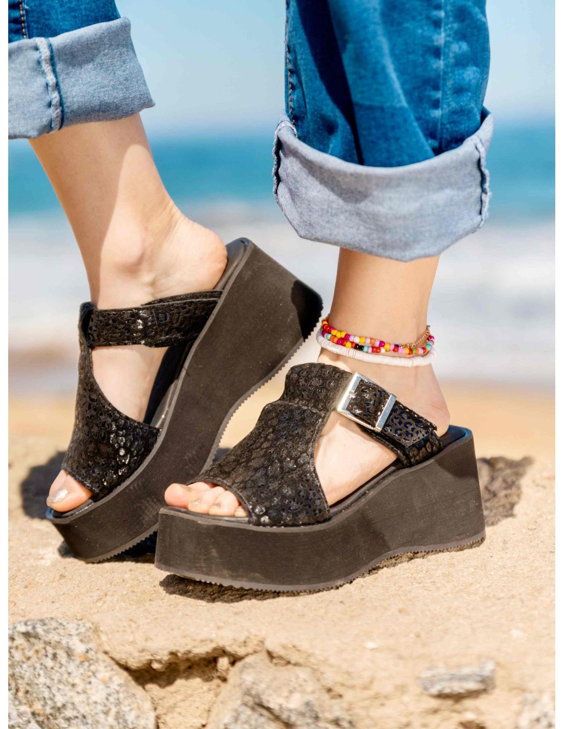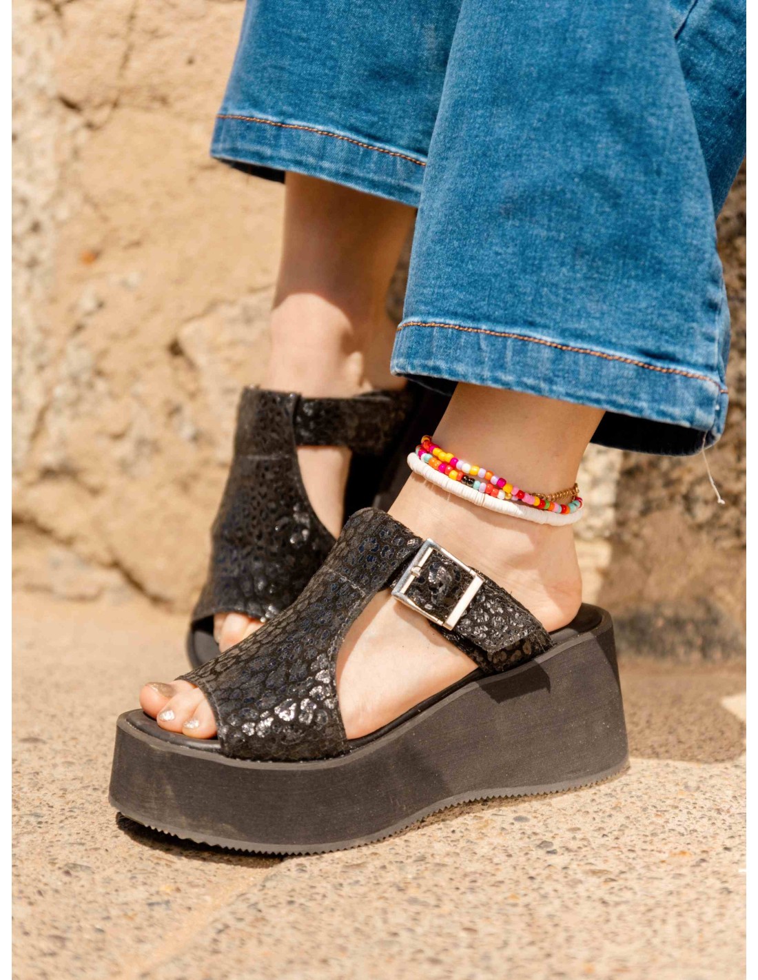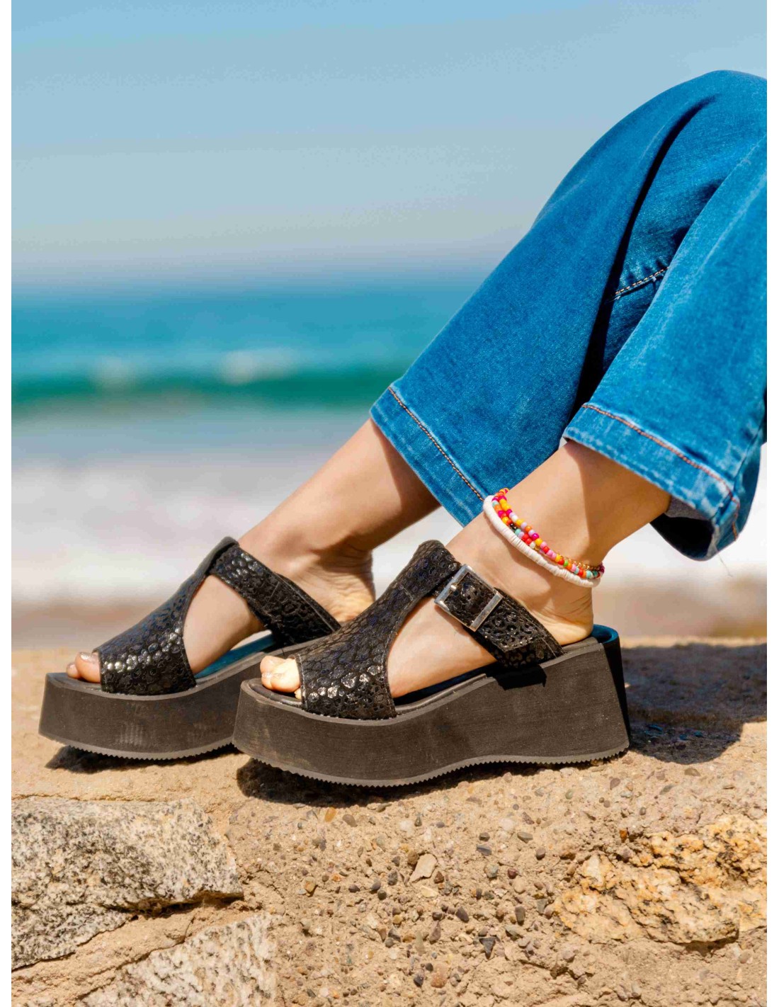 Sandalia de cuero negro agamuzado estampado. Su plataforma es de bajo peso con terminaciones envejecidas pintadas a mano.