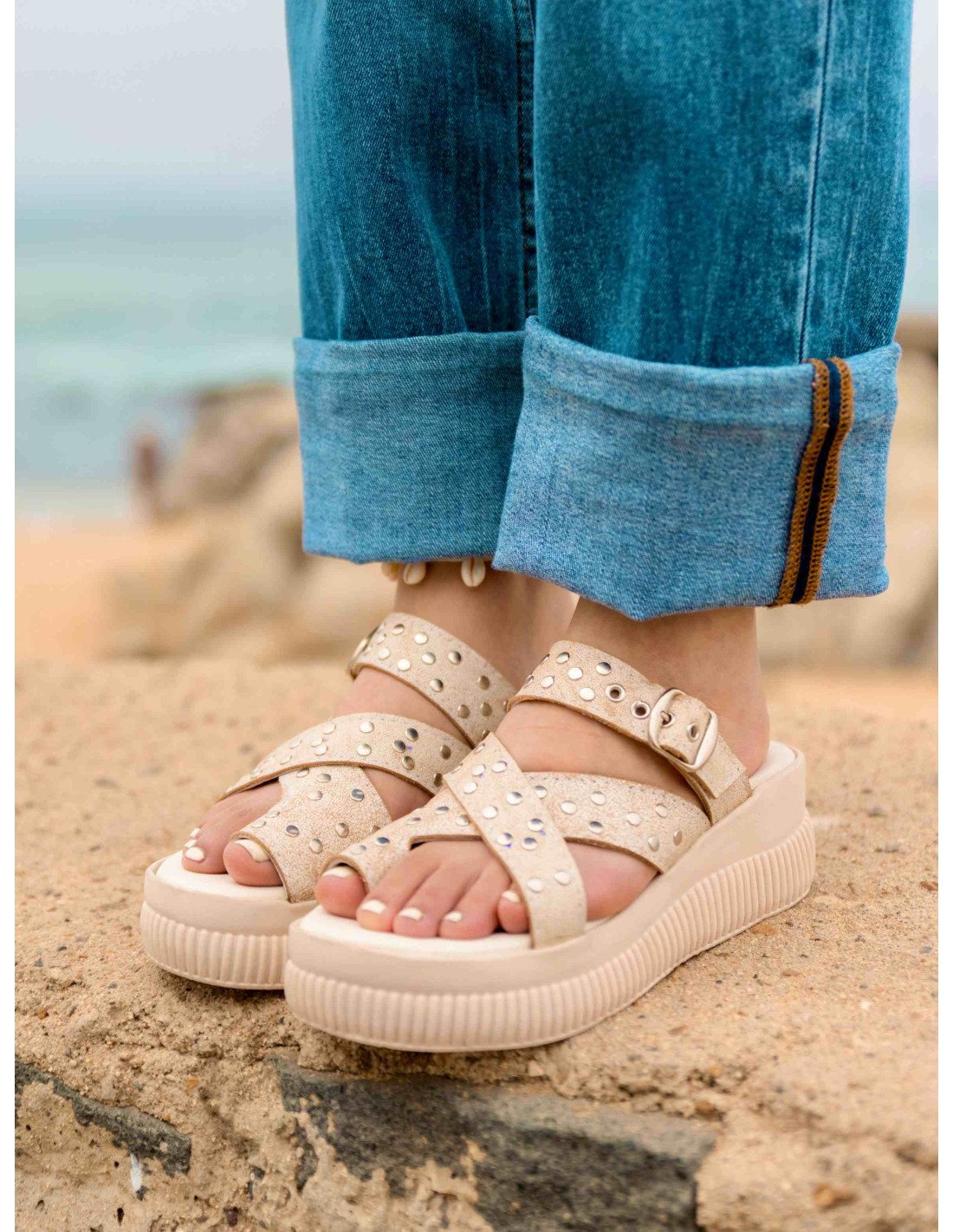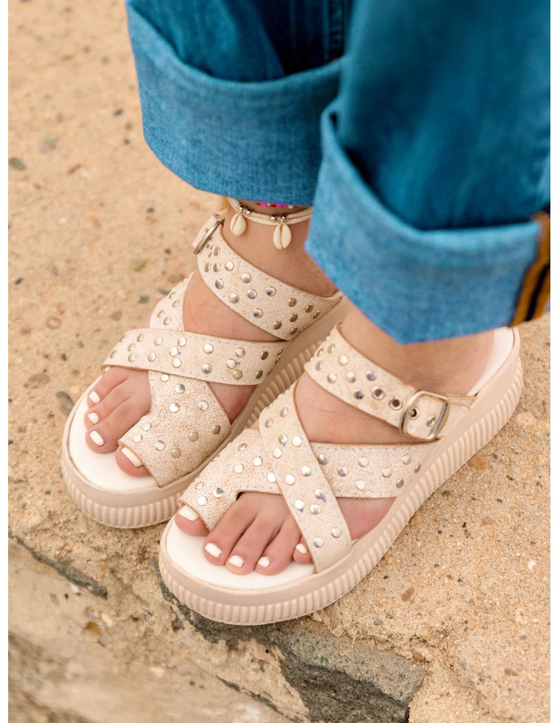 Sandalia de cuero craquelado white, posee correas cruzadas en su empeine y además tiene un semi anillo al dedo, esto le da un ajuste perfecto y seguridad al caminar.