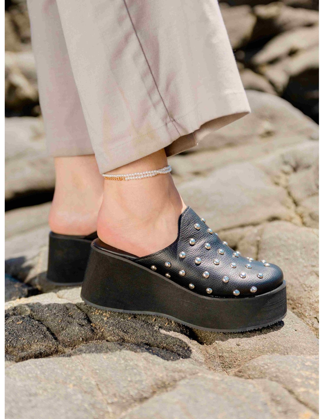 Este sueco fusiona estilo y comodidad, diseñado en cuero con un atrevido negro. Su plataforma de EVA prensada es ultraligera, brindando un toque moderno sin añadir peso. Con tachas en su cuerpo asegura un ajuste ergonómico para una pisada confiable y un look que destaca en cualquier ocasión. ¡Atrévete a marcar tendencia con este imprescindible!