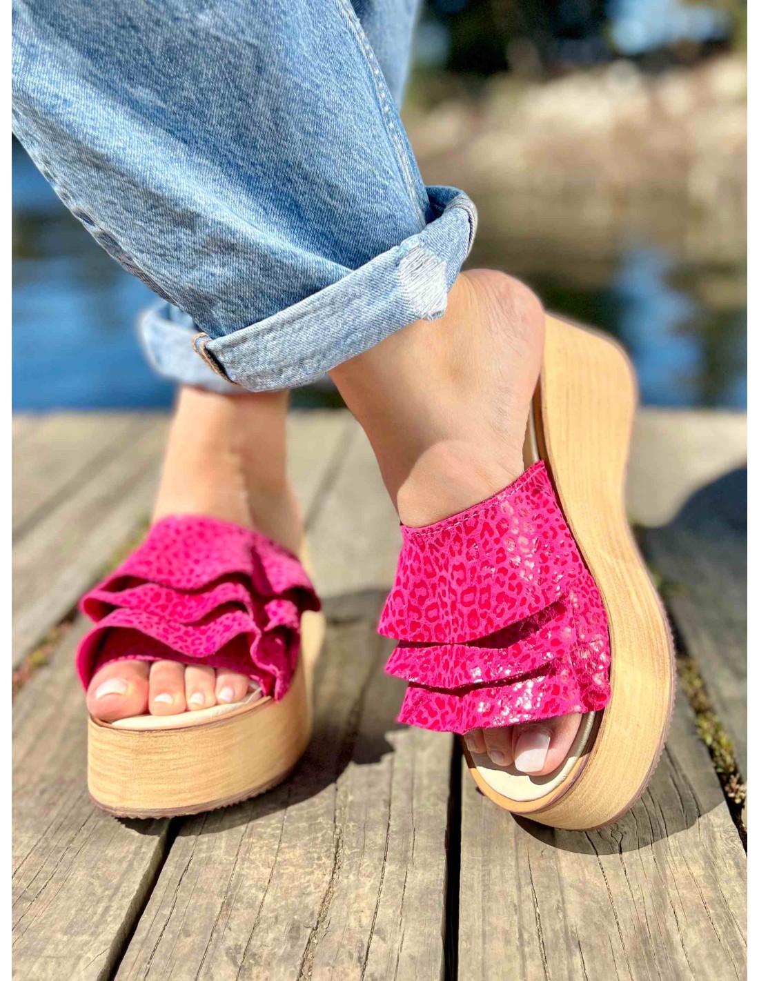 Sandalia de cuero agamuzado fucsia con estampado, con vuelos en su cuerpo para darle un toque de originalidad y dulzura perfecto.