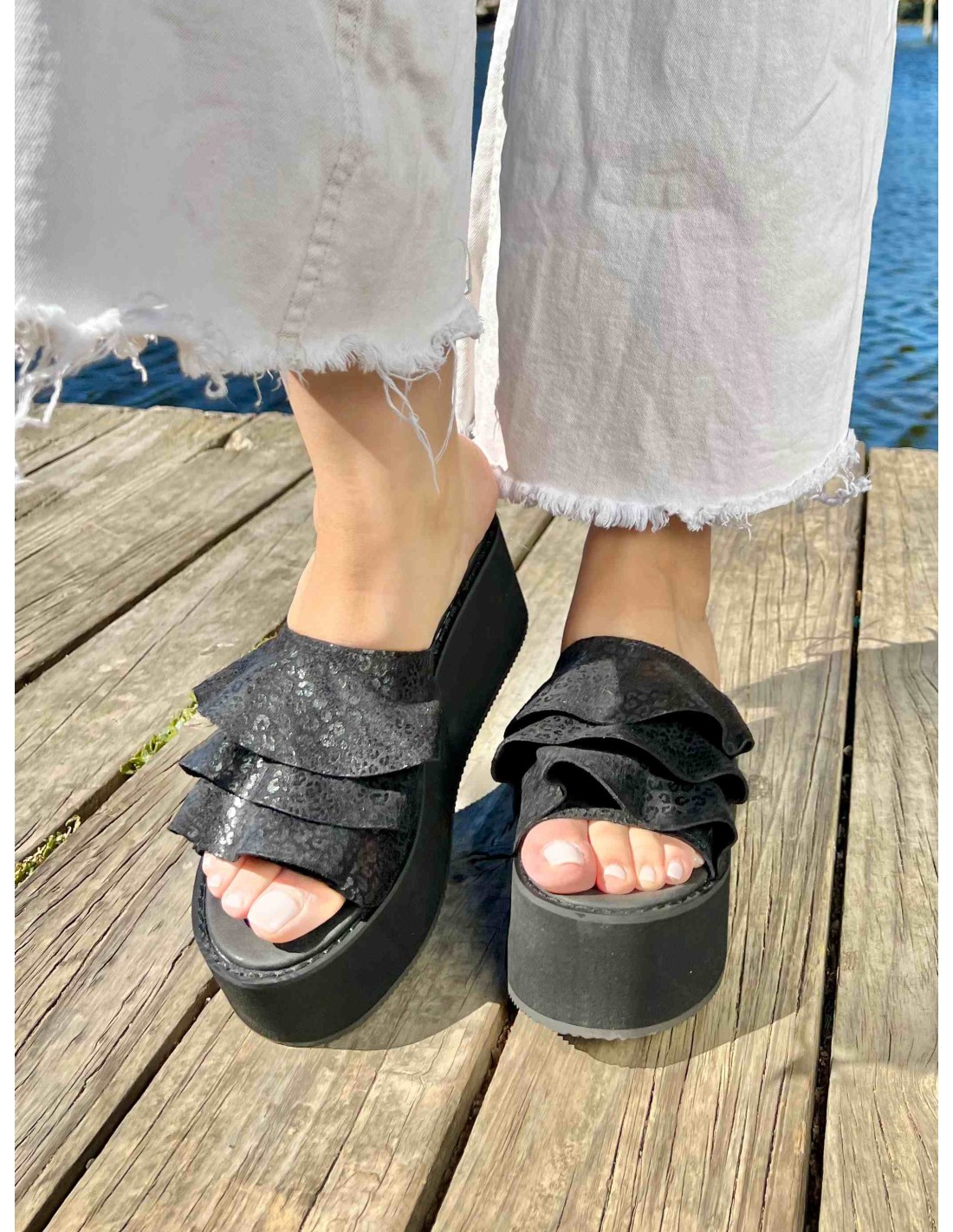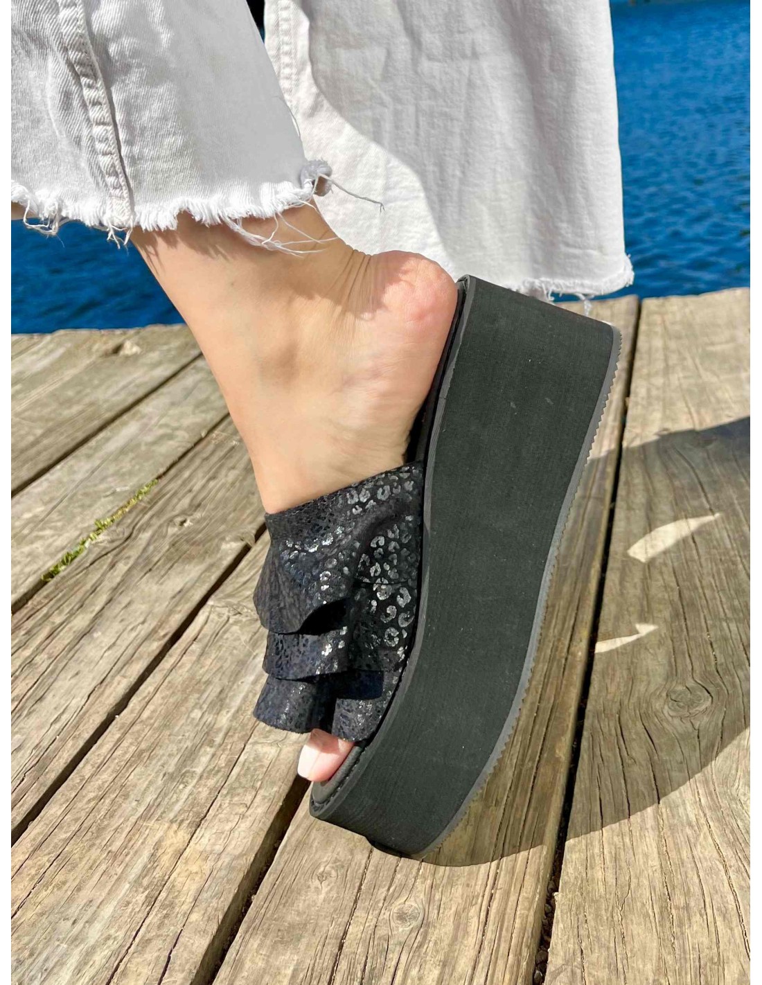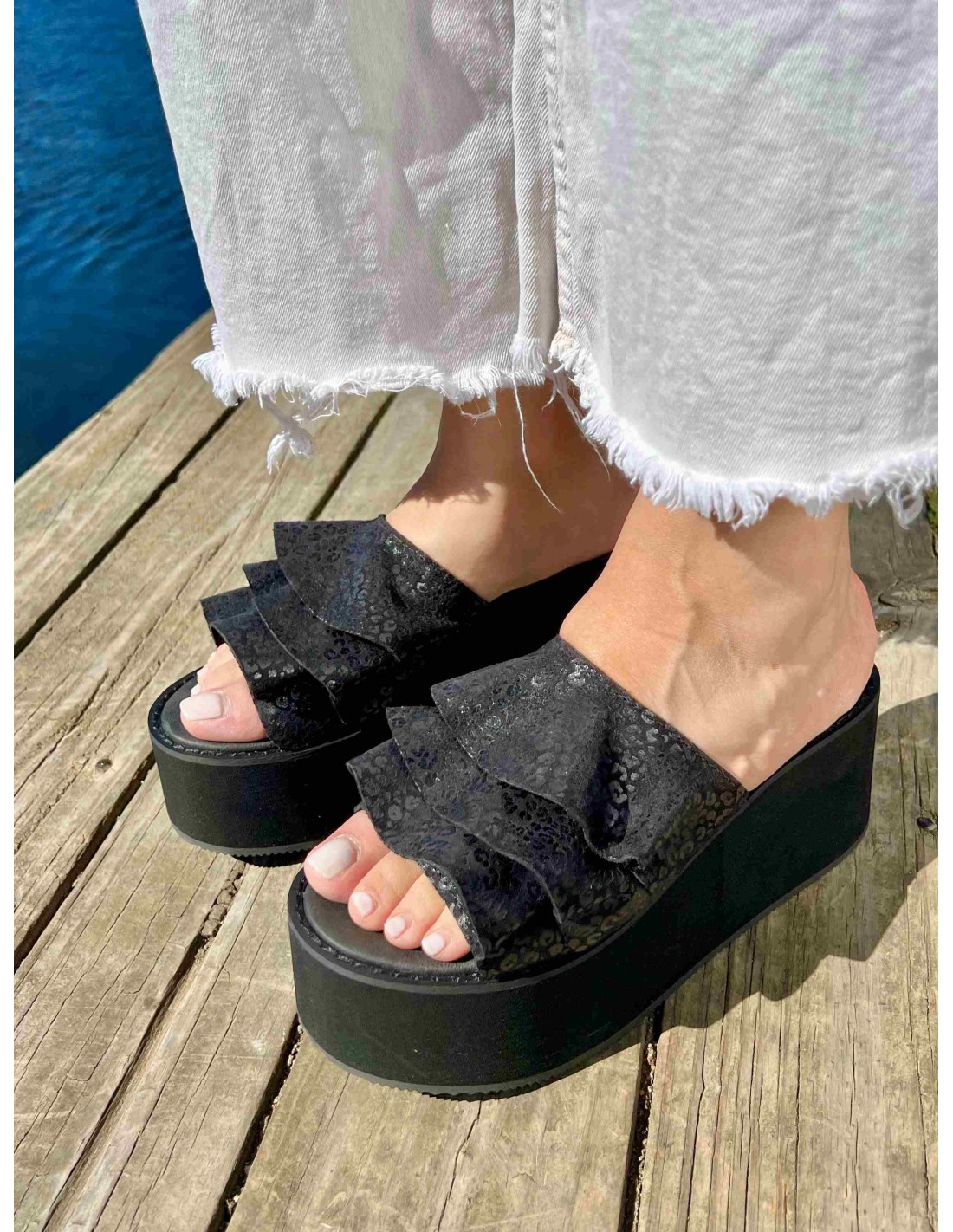 Sandalia de cuero agamuzado negro con estampado, con vuelos en su cuerpo para darle un toque de originalidad y dulzura perfecto.
