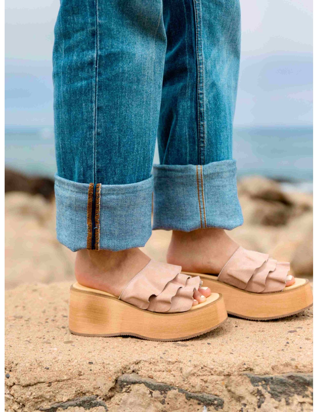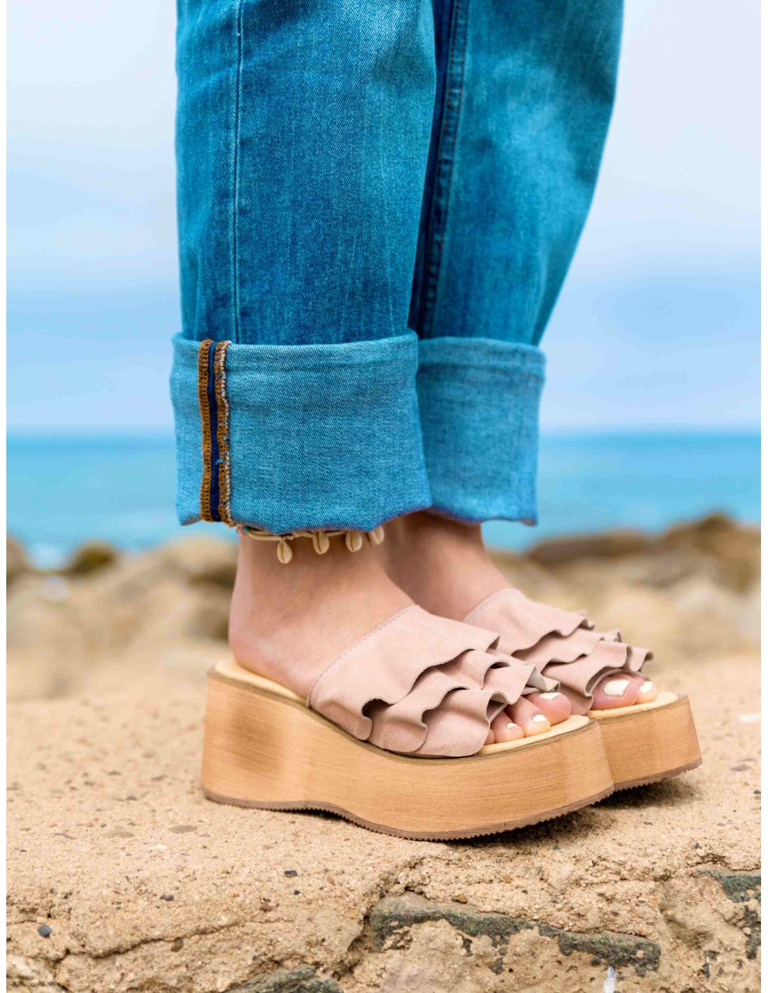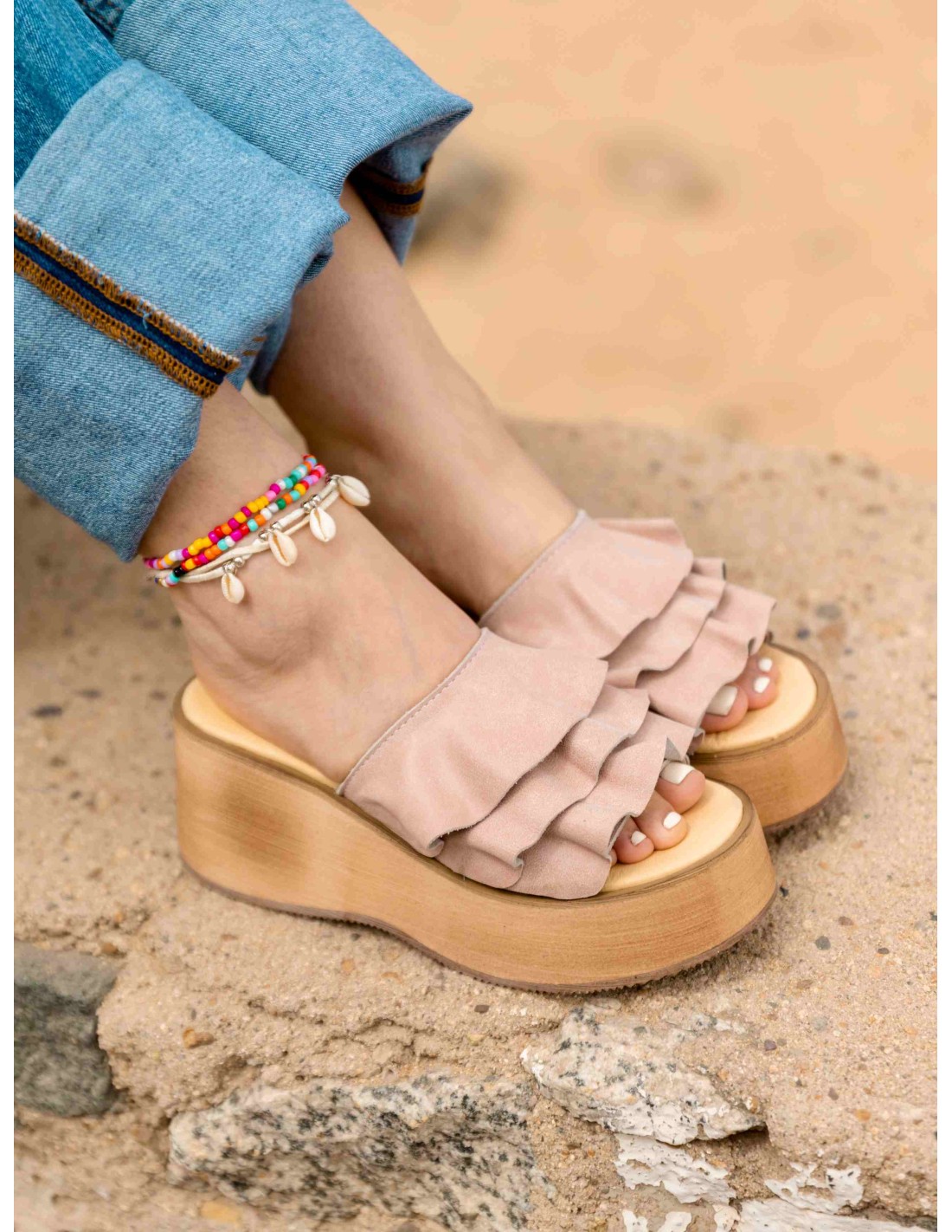 Sandalia de cuero agamuzado fucsia con estampado, con vuelos en su cuerpo para darle un toque de originalidad y dulzura perfecto.