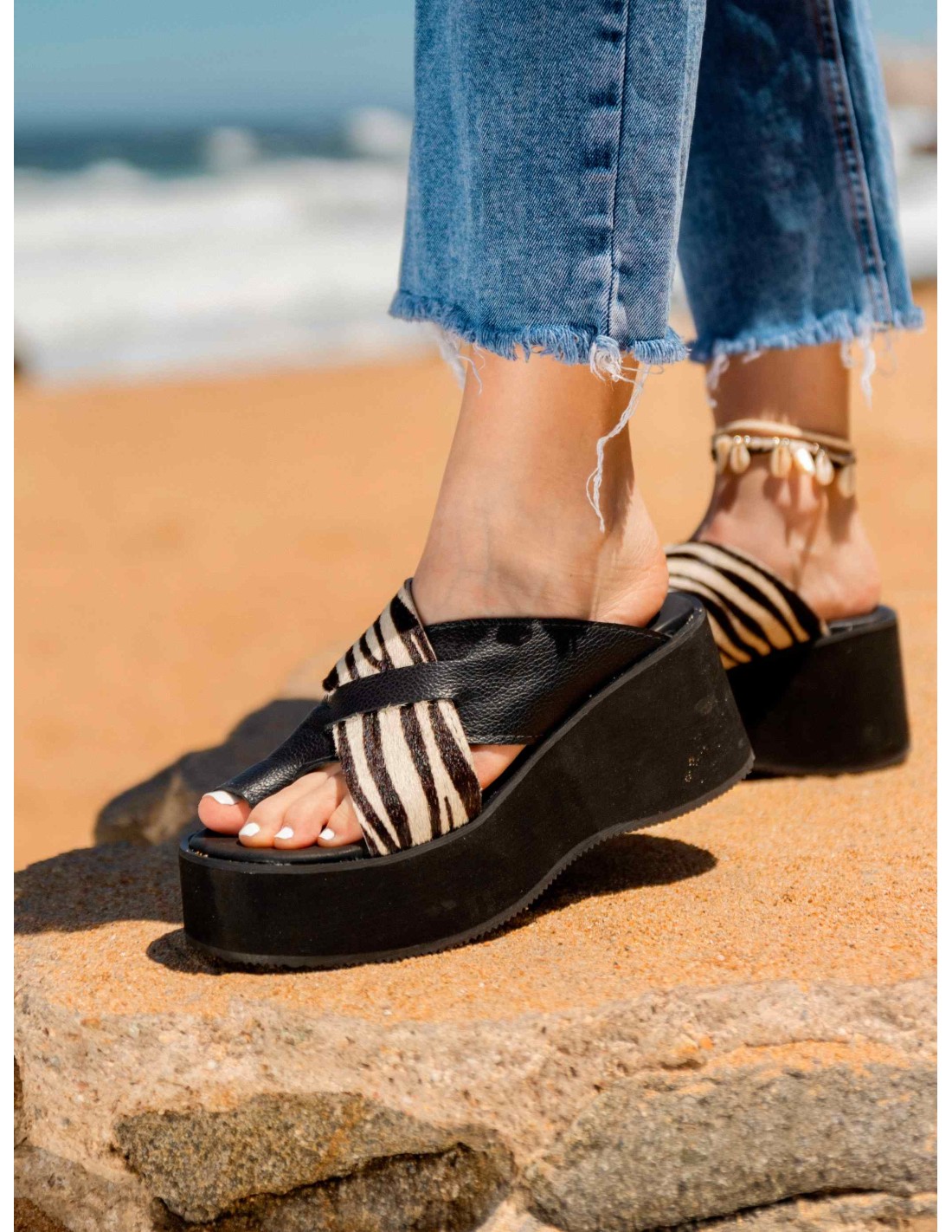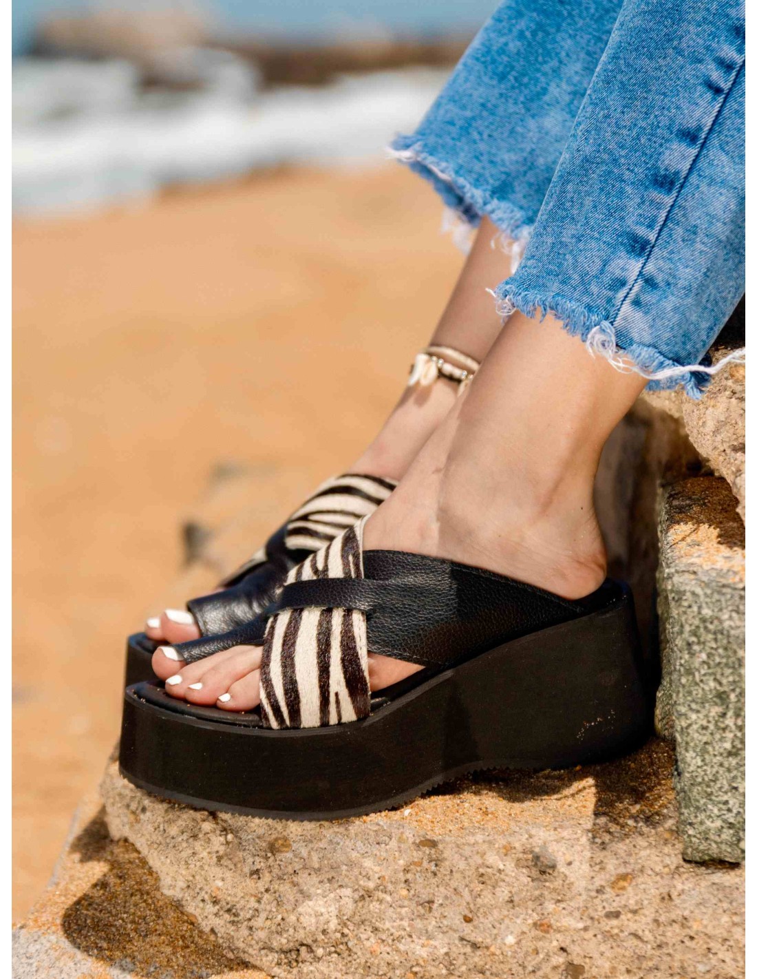 Sandalia de cuero negro y cebra, posee correas cruzadas en su empeine y además tiene un semi anillo al dedo, esto le da un ajuste perfecto y seguridad al caminar.