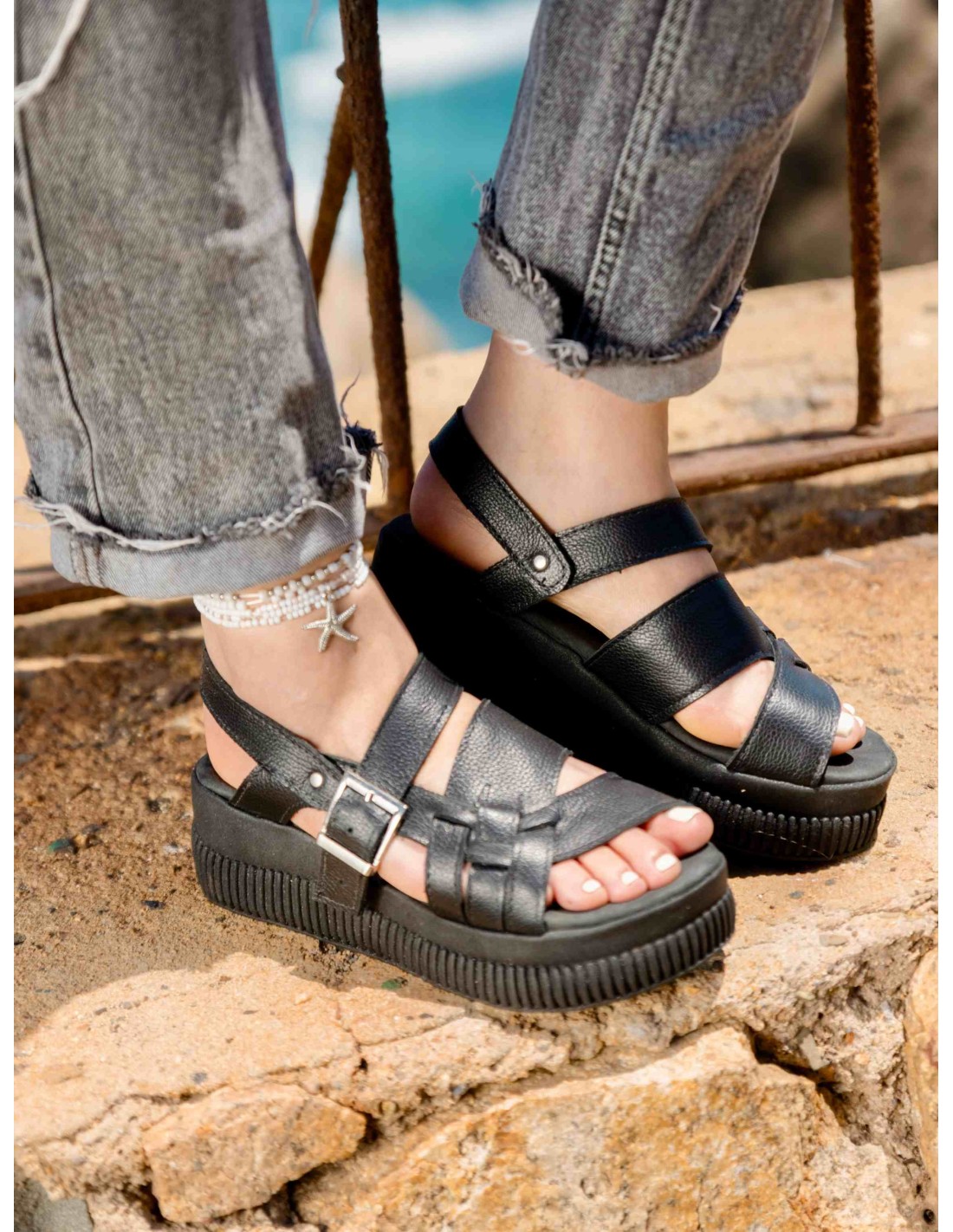 Sandalia de cuero negro con correa en su talon , para darle seguirdad increible y comodidad.