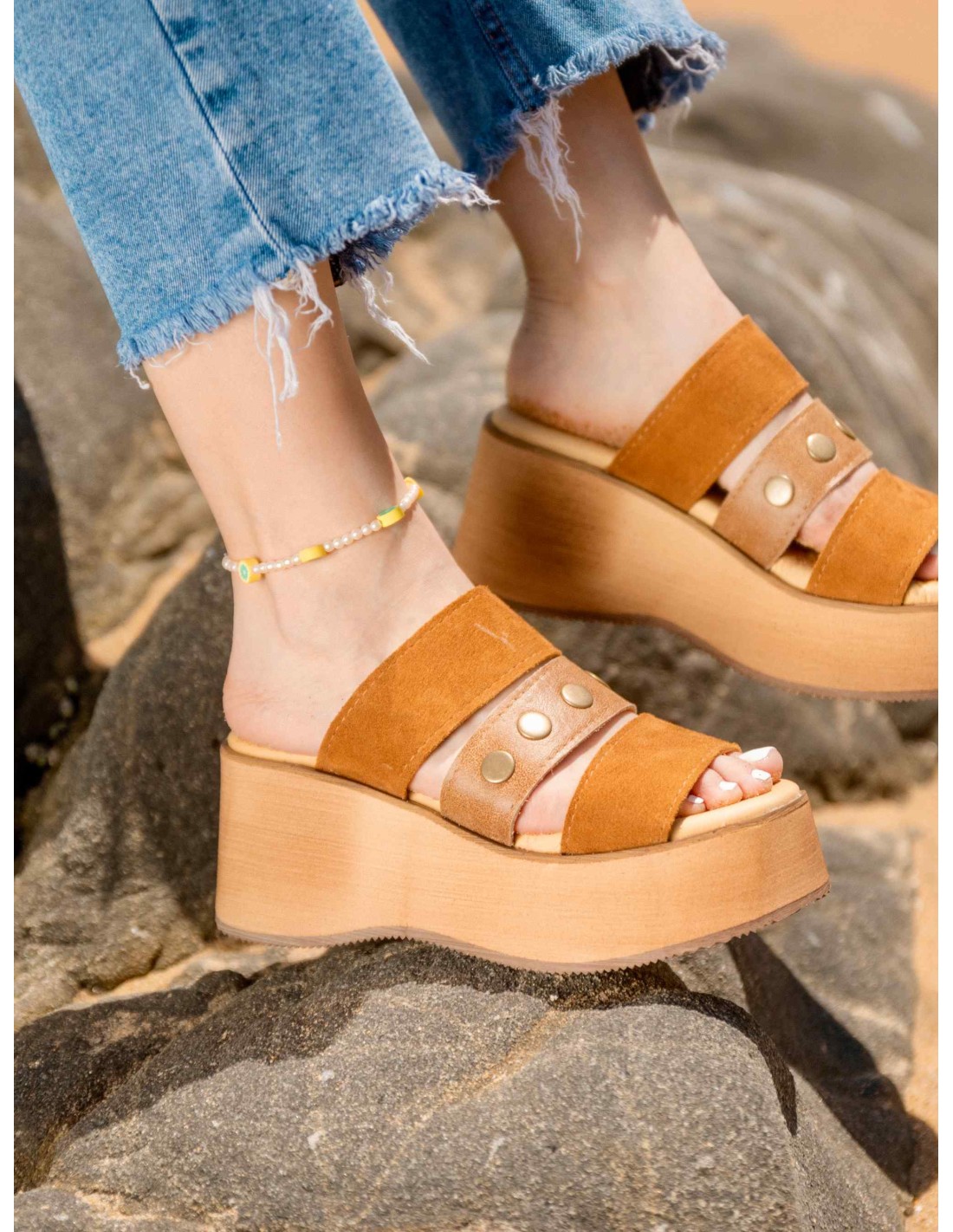 Sandalia de cuero camel con 2 combinaciones de cuero y tachas como detalle. Su plataforma es de bajo peso con terminaciones envejecidas pintadas a mano.