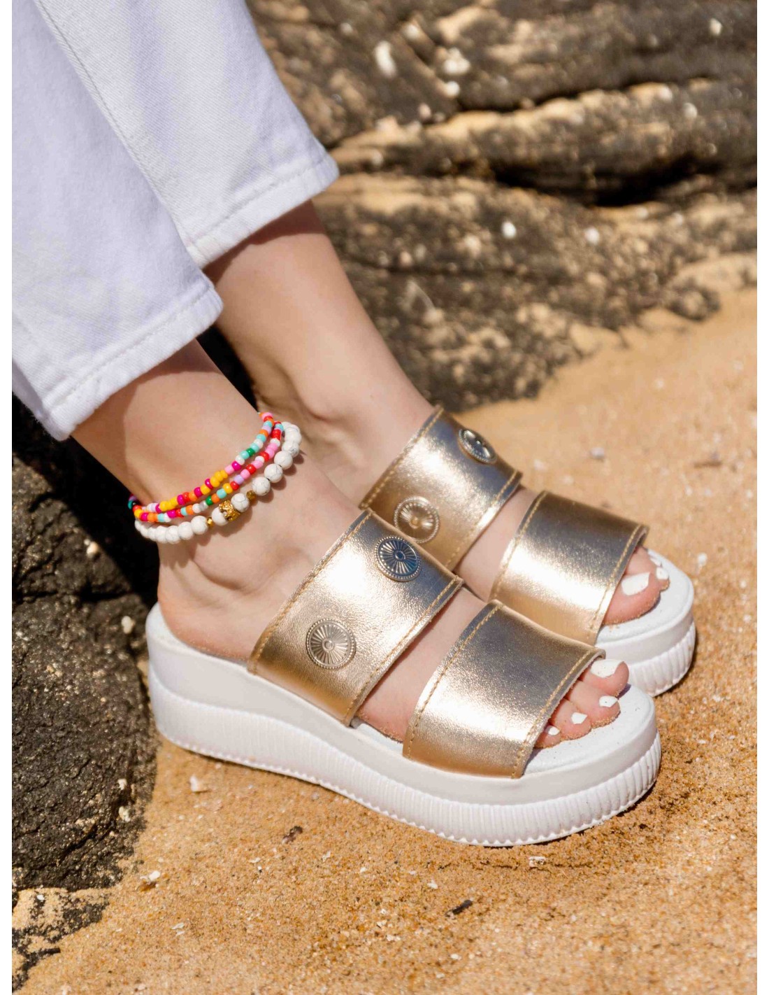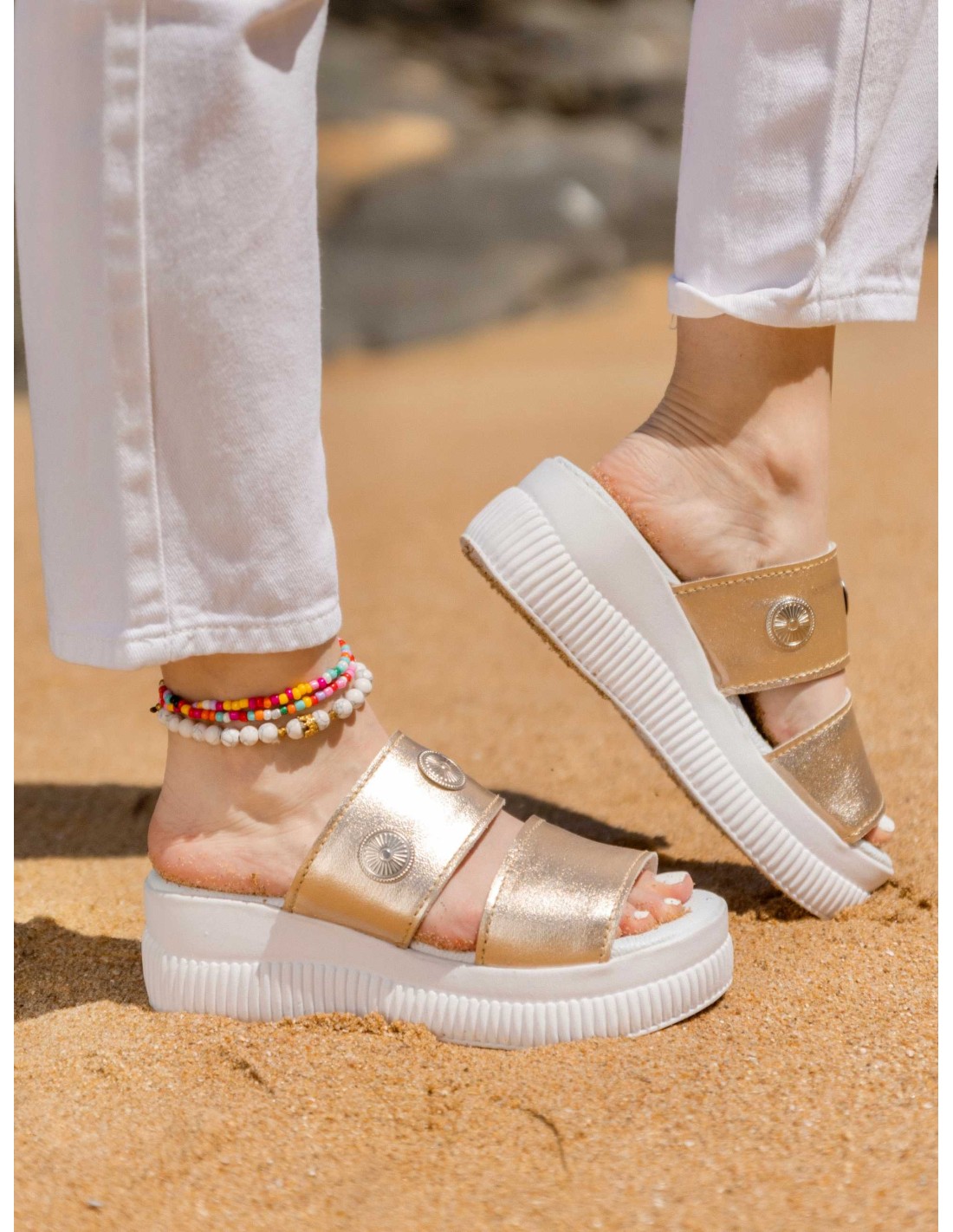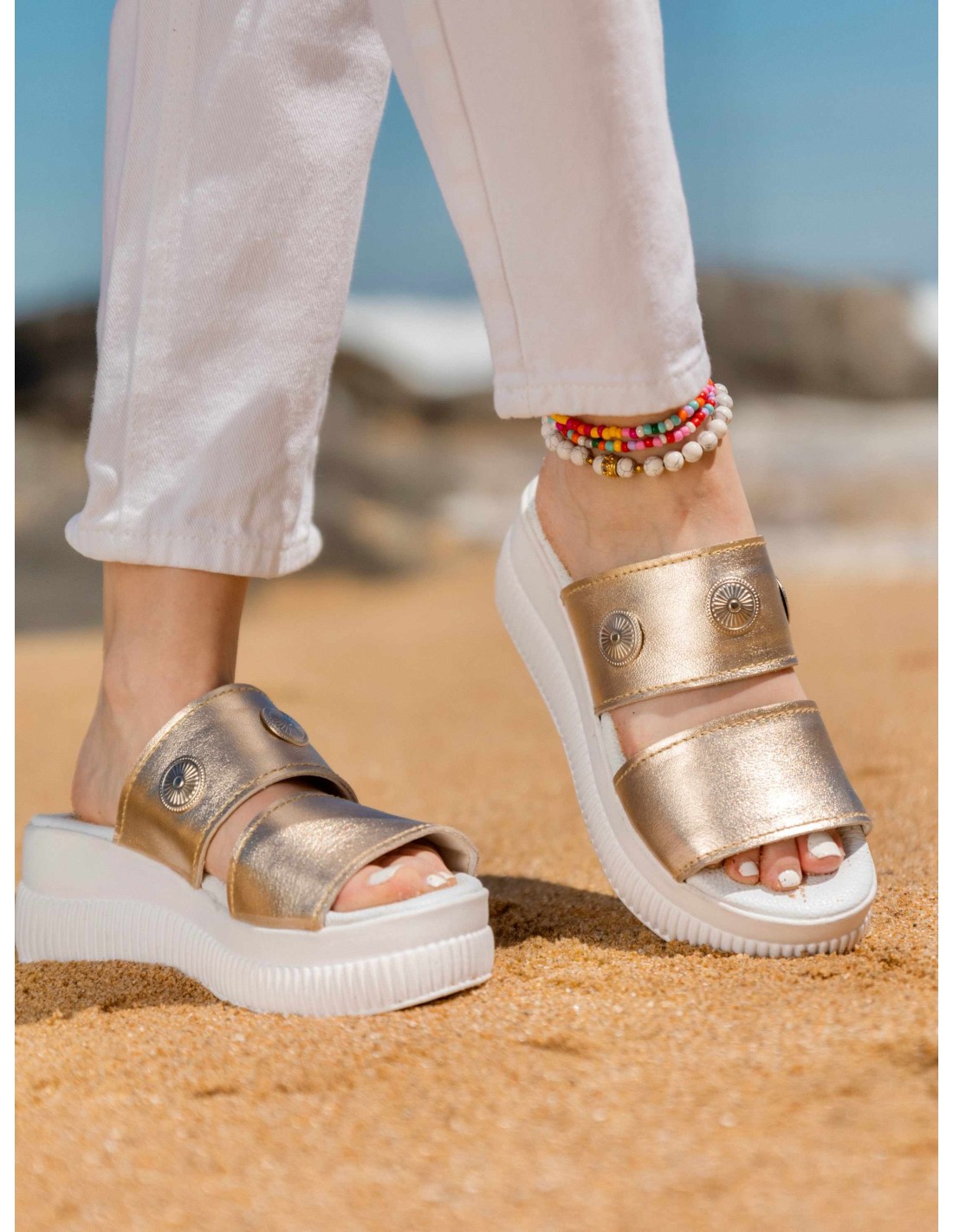 Sandalia de cuero Dorado, para darle seguridad increible y comodidad.